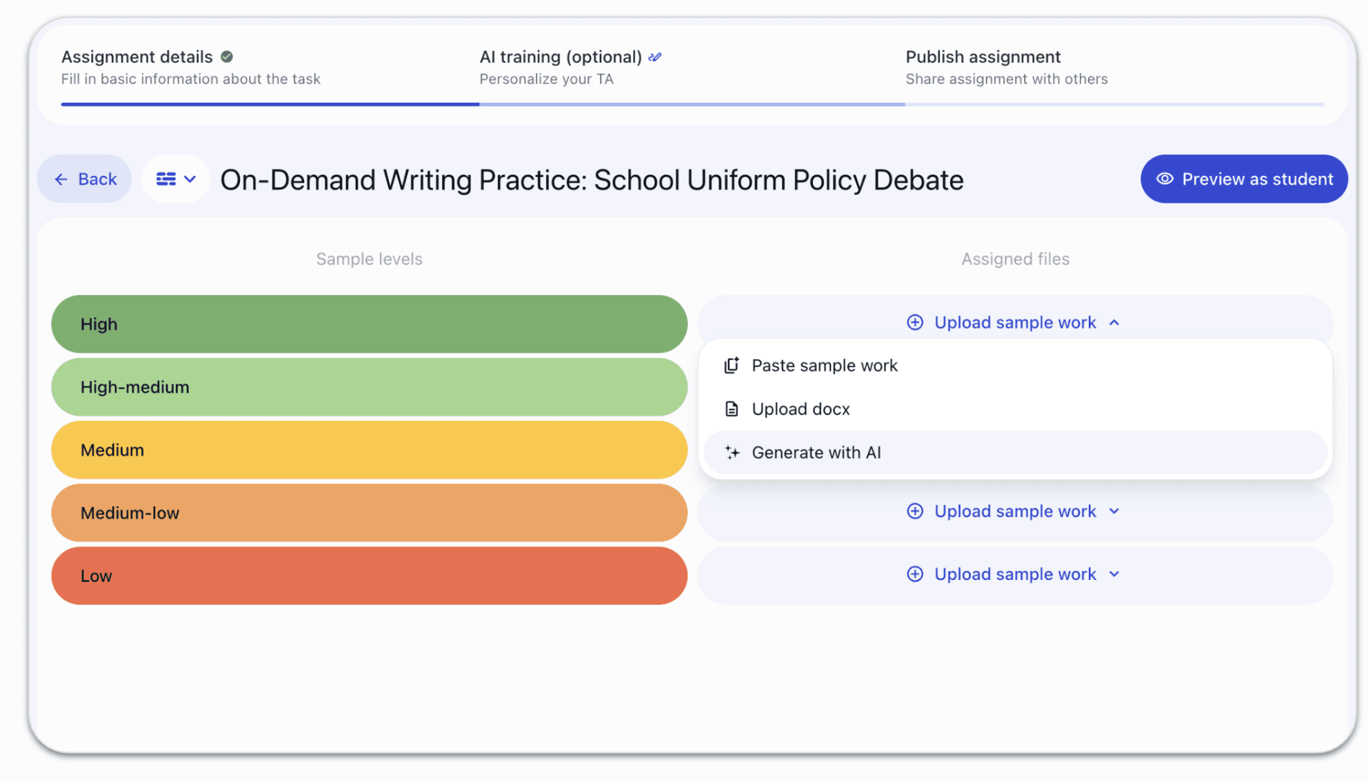 When you click the Upload / Sample Work button during assignment setup, you’ll now see a new option: “Generate with AI”