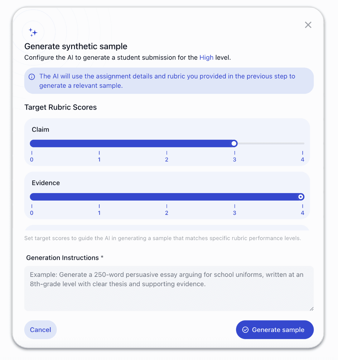 Clicking “Generate with AI” opens a new window that’s designed specifically for teachers who want targeted, rubric-aligned student samples.