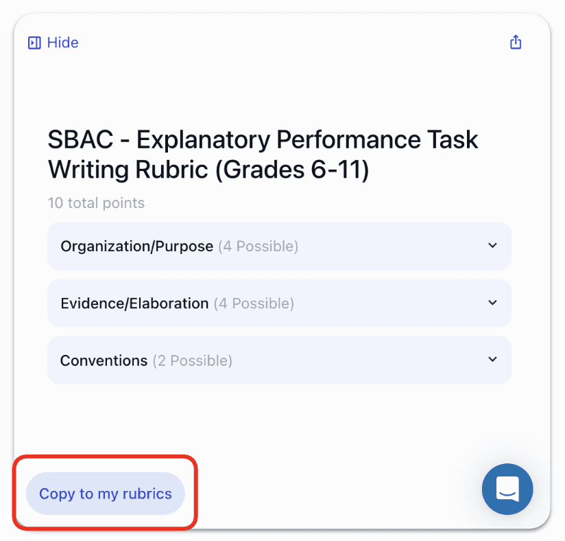 The EnlightenAI Rubrics Library is a common starting point, offering AP rubrics, state-aligned rubrics, and other widely used templates. Many teachers copy an existing rubric and then edit, condense, or adjust it to fit their specific context. You can always click “Copy to my rubrics” to begin customizing a rubric for your class.
