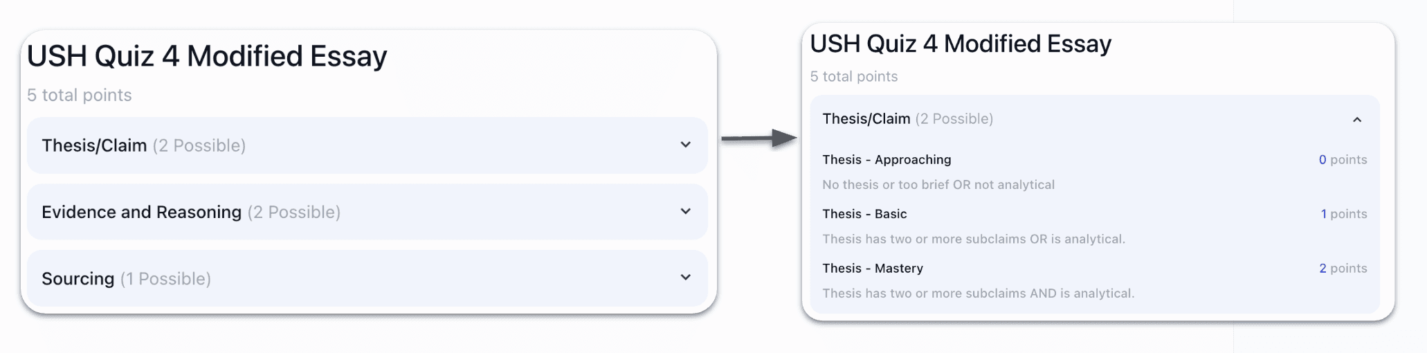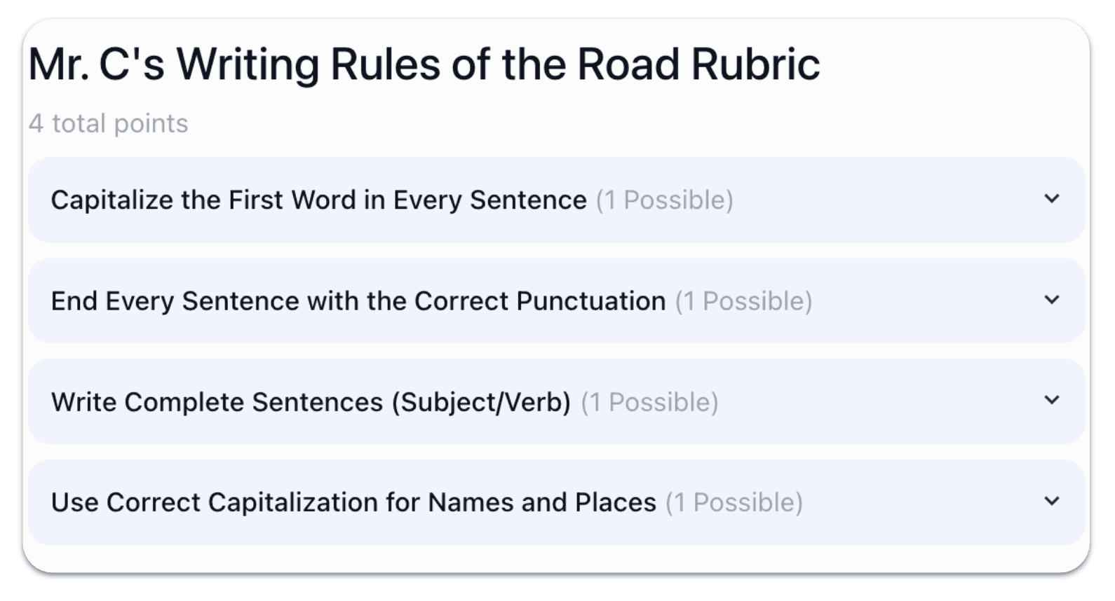 During the writing process for larger assignments, we also often see teachers intentionally simplify. Instead of introducing a full, complex rubric too early, they use a pared-down version focused on just a few priority skills. Students know the full rubric is coming at the end, but the simplified version helps guide feedback while they are still drafting and revising.