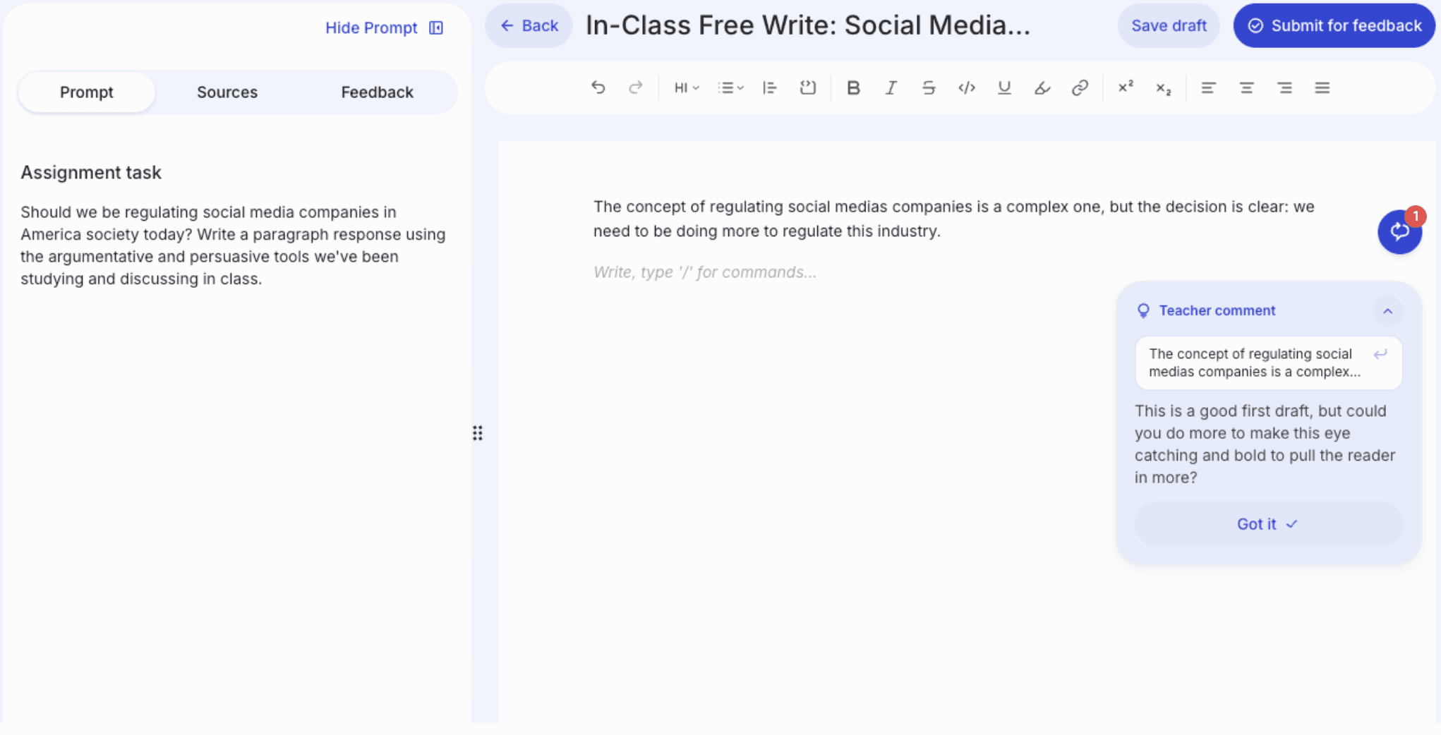 The research on writing instruction is consistent on one point above all others: feedback timing is everything. When students receive specific, actionable feedback while they're still in the act of writing — while the work is live, while revision is still possible — improvement happens faster and sticks longer. The Live Classroom Dashboard puts teachers in position to act on that window every single class period, not just when they happen to be at the right desk at the right moment. More visibility means more targeted interventions, fewer students slipping through, and a sharper use of every minute of instructional time.