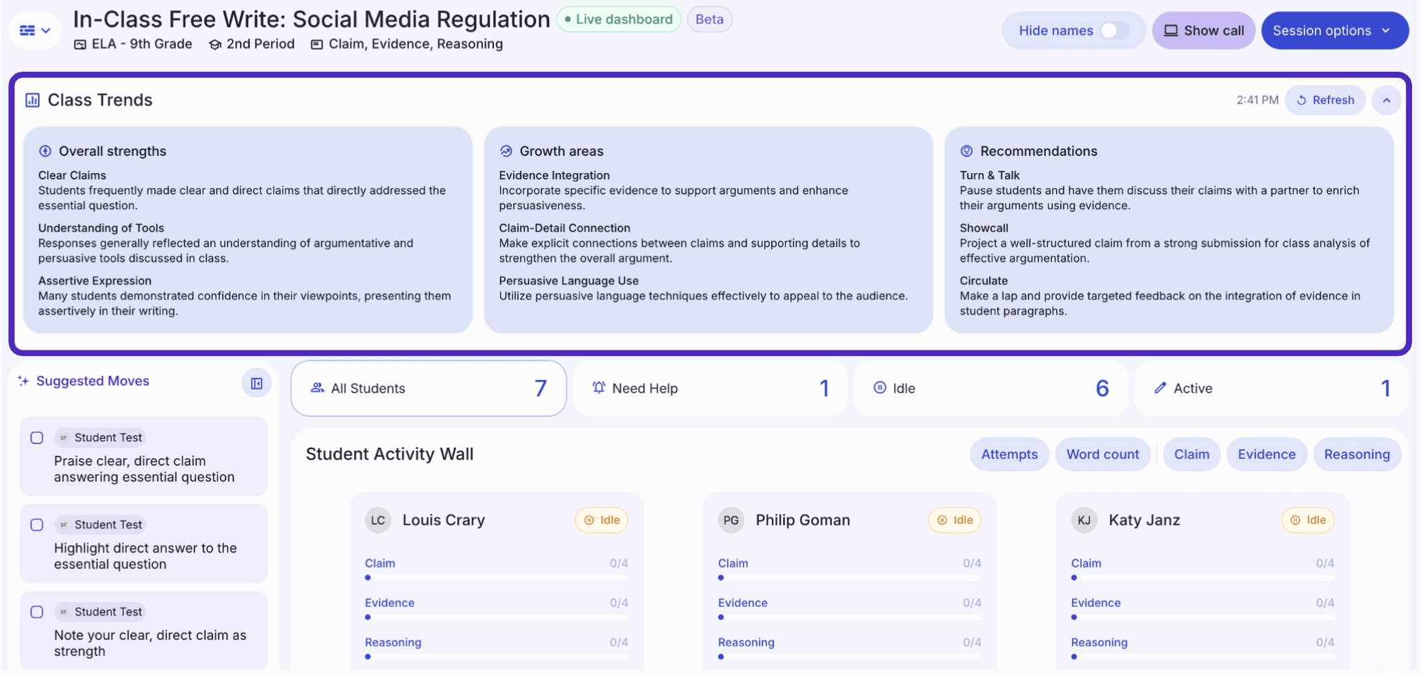 Real-time trend data changes something else too: it shifts the decision about what to teach from intuition to evidence. When you can see, mid-session, that 18 out of 26 students are describing evidence rather than analyzing it, you don't have to guess whether a whole-class pause is worth it. You know. The Class Trends panel surfaces exactly these patterns — strengths, growth areas, and specific instructional moves — so teachers can make better decisions about when to circulate, when to stop the class, and when to let the writing continue.
