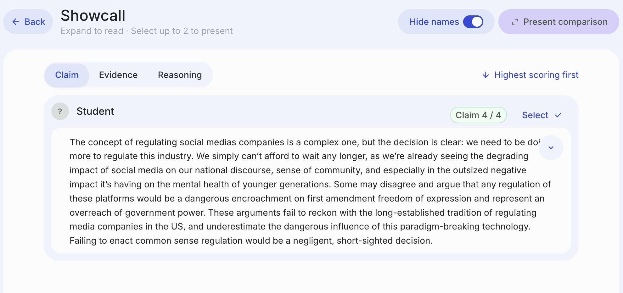 ShowCall lets you select up to two student drafts and present them anonymously to the class in a clean, full-screen view. You can sort by any rubric trait — highest to lowest, lowest to highest — to quickly find a strong example, a developing example, or a comparison that will spark a useful whole-class discussion.
