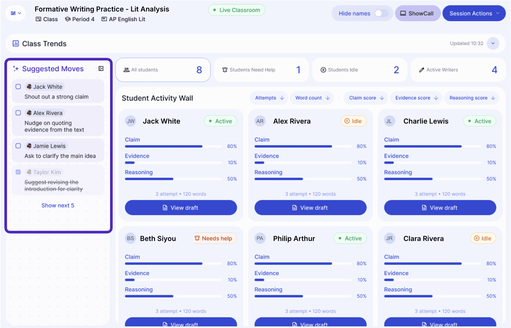 Suggested Moves solves this. Based on each student's most recent strength and growth area from their AI feedback, the panel generates a prioritized list of interventions — a mix of shout-outs (public praise for a student doing something well) and nudges (targeted check-ins for students who need a redirect). Five cards at a time, with a "Show more" button if you want additional suggestions.
