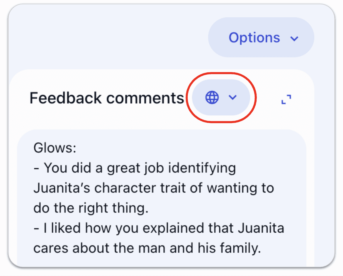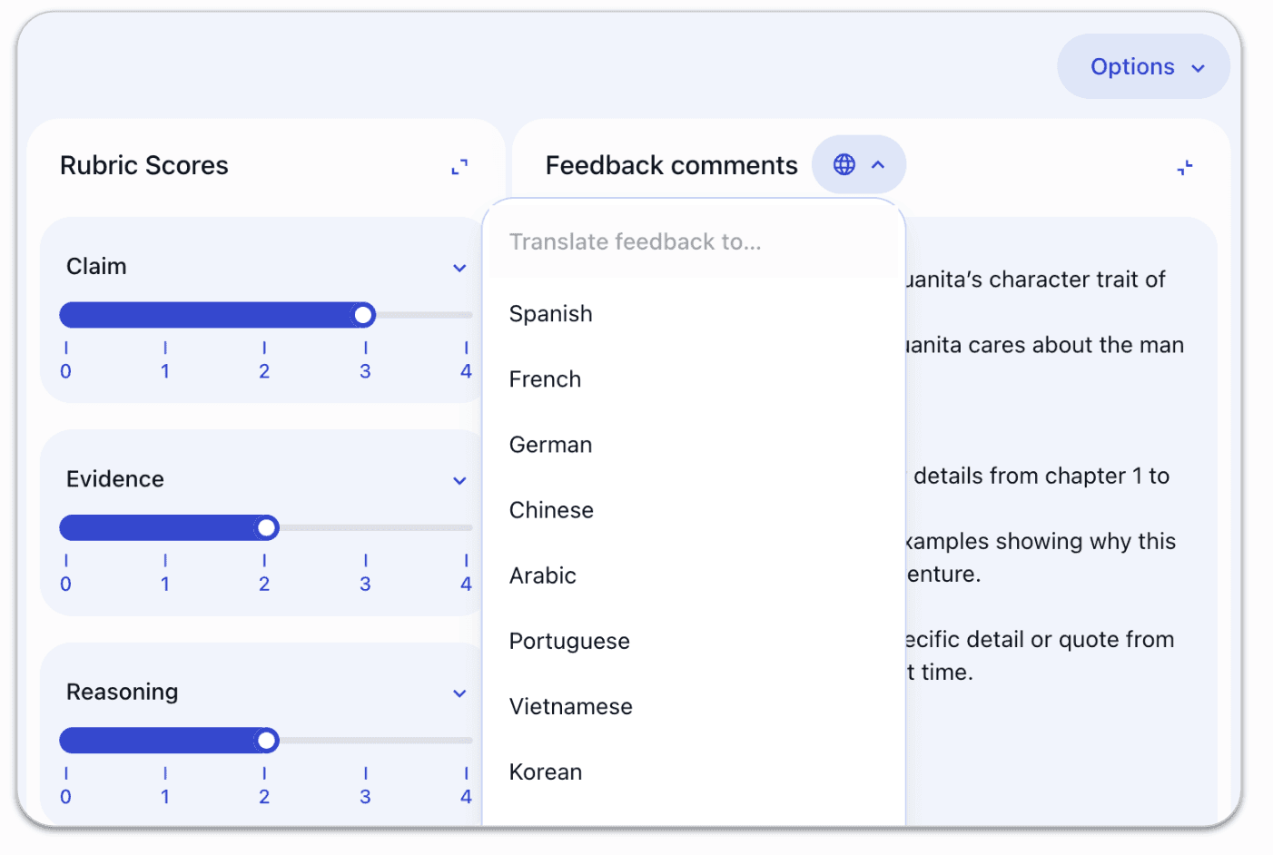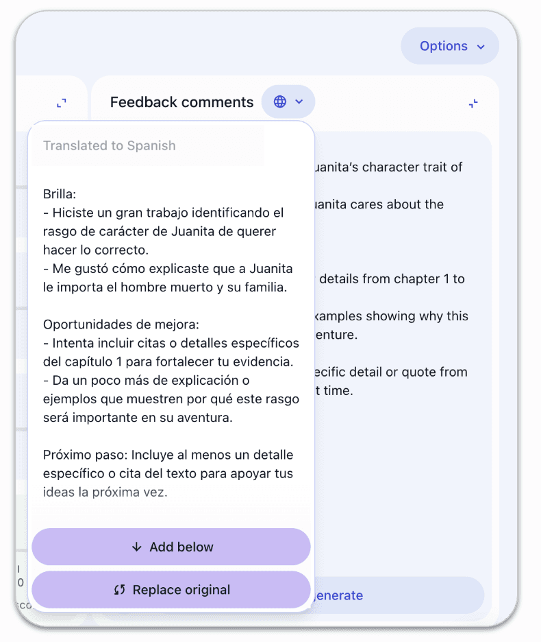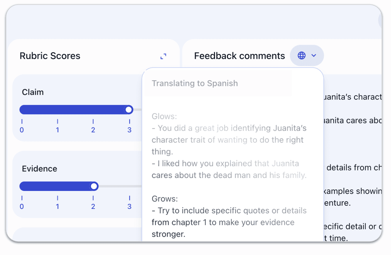 We’ve also heard that while AI grading and AI writing feedback can save time and improve consistency, teachers still need flexibility. Sometimes feedback needs to be translated for an individual student. Sometimes teachers want to provide feedback in both English and another language. And sometimes student writing itself is not in English.